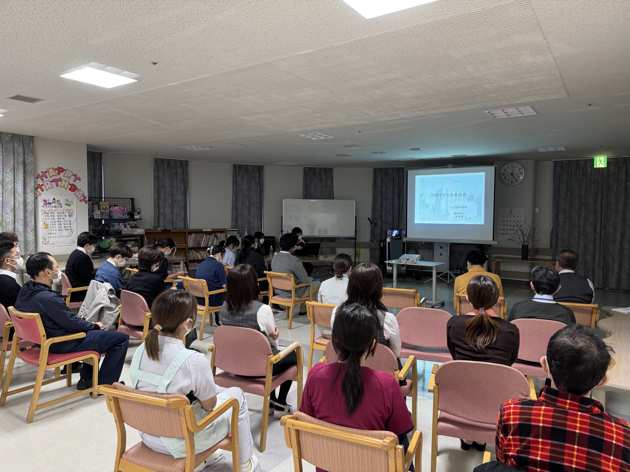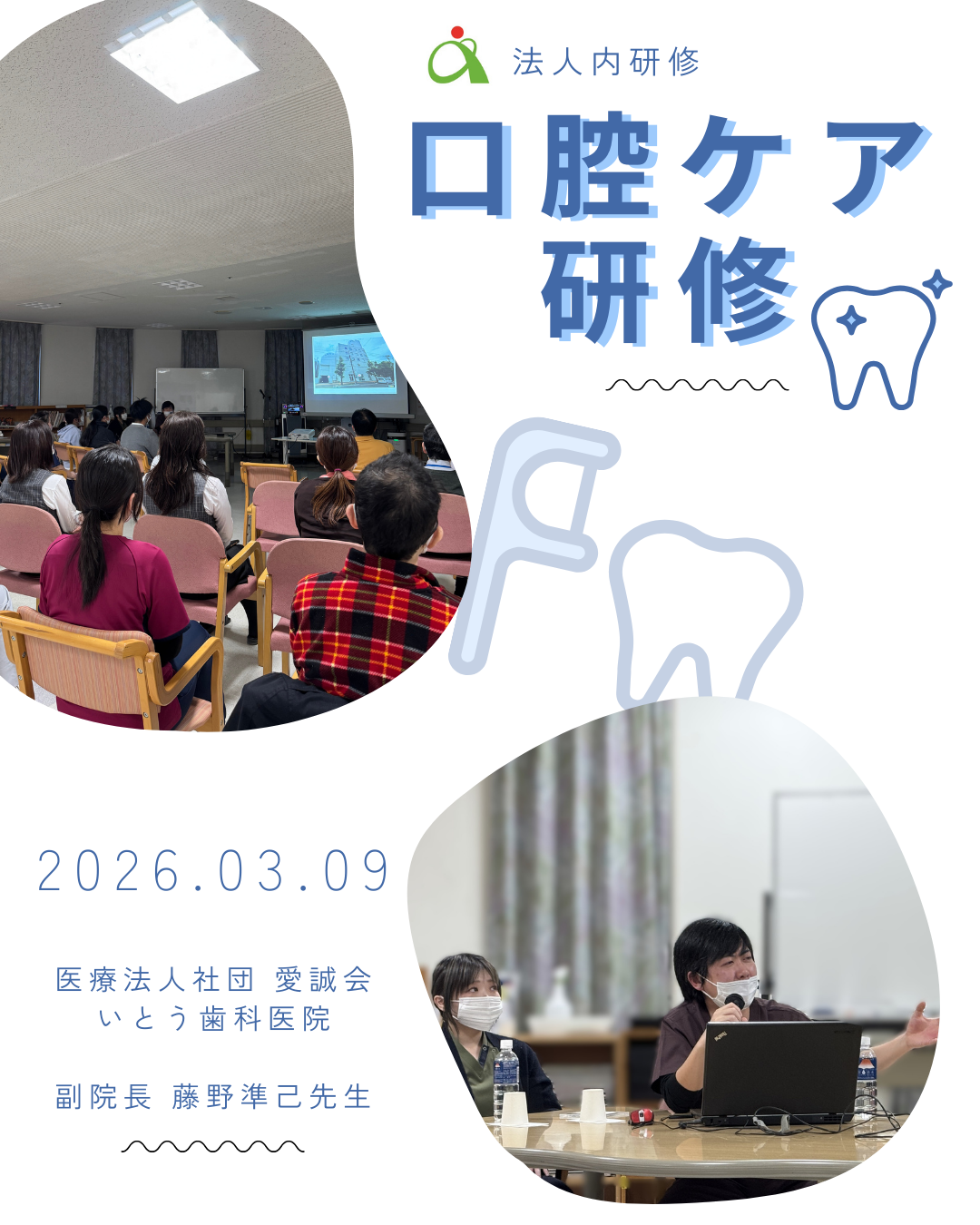 1時間 ago 令和8年3月9日に法人内研修を開催しました。 今回のテーマは、「口腔ケア」。 医療法人社団愛誠会 いとう歯科医院 副院長である藤野準己 先生に講義をして頂きました。 「高齢者の口腔内の特徴」「口腔内の観察ポイント」などをわかりやすく説明して頂きました。 口腔ケアの意義、口腔ケアによるQOL向上の可能性を考える大変有意義な機会となりました。 Categories: 法人からのお知らせ
