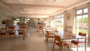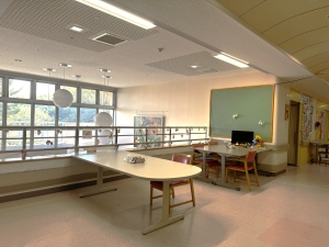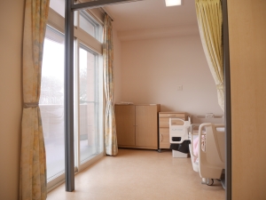 窓面積が広いため自然の光を多く取り入れ、自然の緑も目に映り解放感やゆとりを感じられます。各居室には専用のトイレ、洗面台があります。多床室はプライバシーに配慮するため間仕切りによって仕切られており、個人の空間・居室となっています。